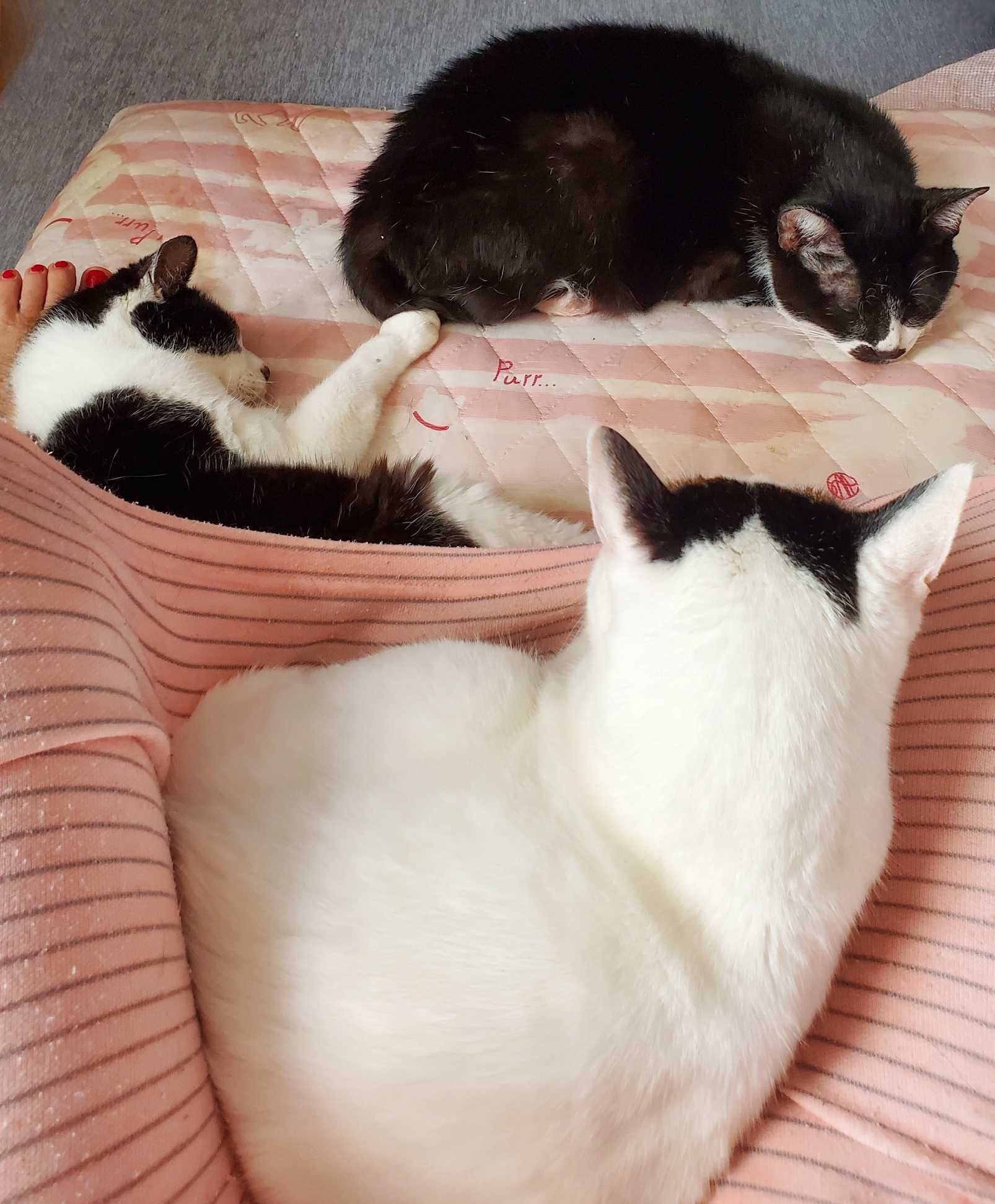 私がテレビ画面でYouTubeを観ていると、いつの間にか、猫達が私の膝の上に😅