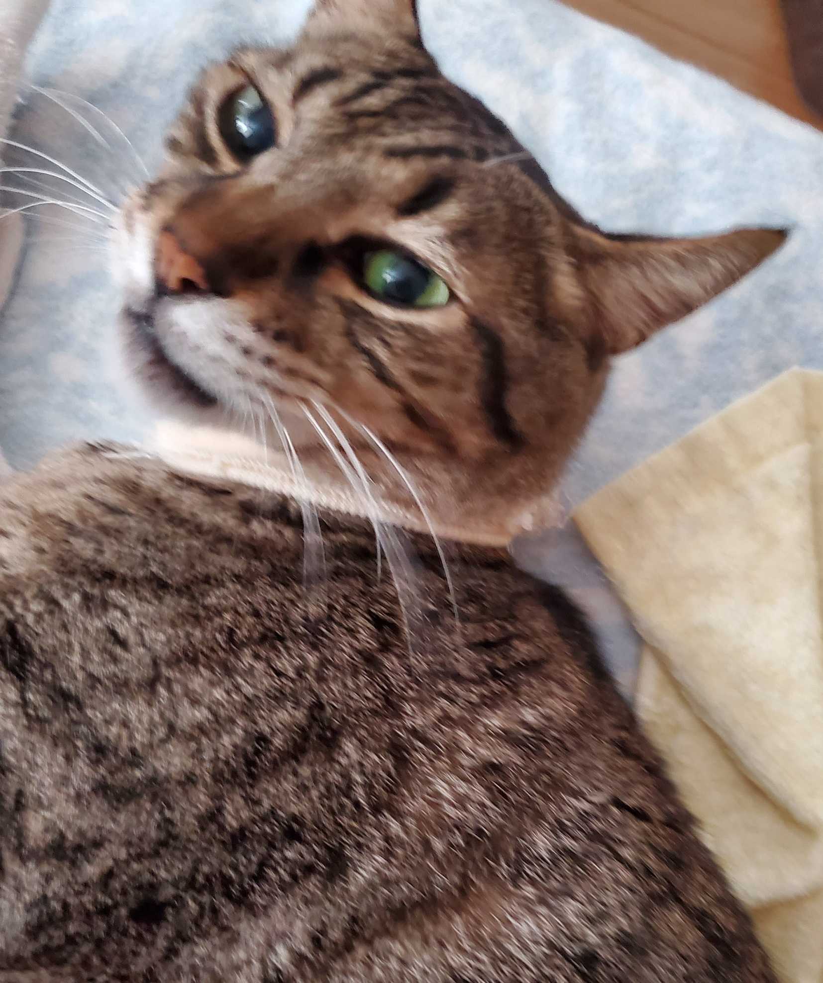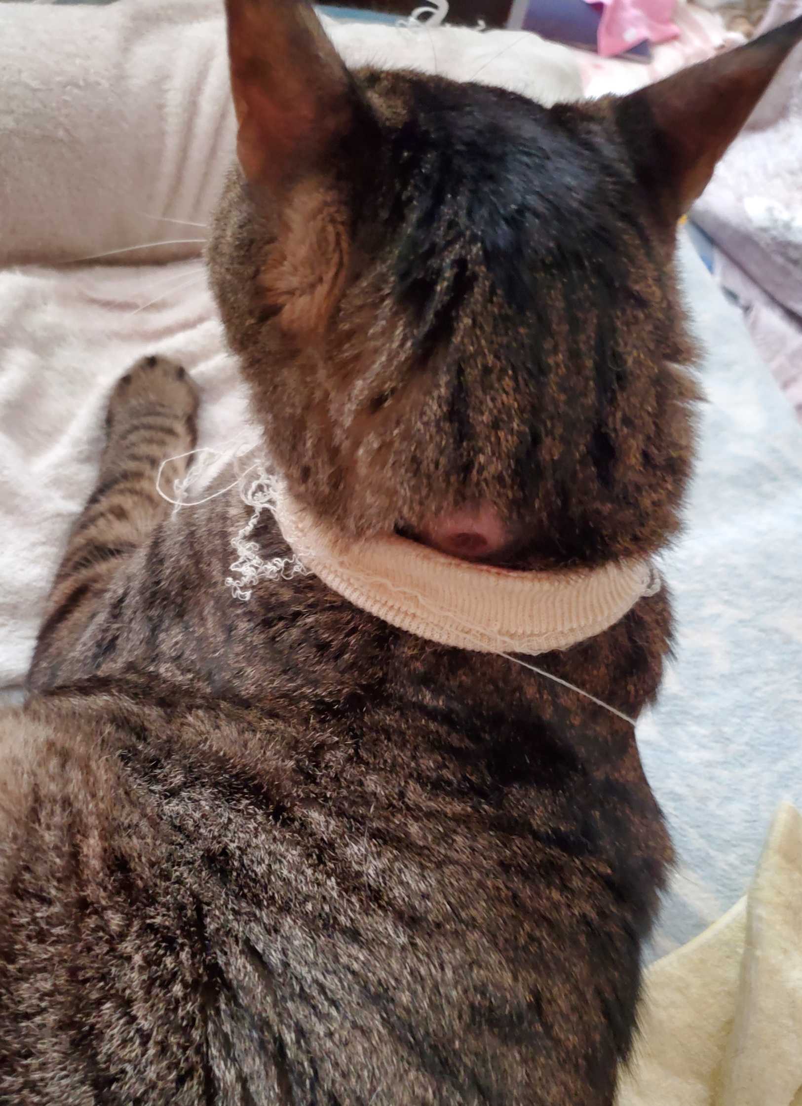 受診後、2日経ってやっと私の側に来てくれました。首の包帯?は既にボロボロ。取り換えてあげないと‼️あら!傷痕が出ているし…。糸がほつれてきたし。次回の受診は火曜日。また、私から2日間は逃げるかな。ほんと、我が家のビビリーNo.1。No.2は、茶々丸だけど。