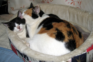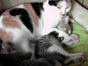まりんは母性愛豊かで、やはり小さくて保護したキジトラのキコやマキ姉妹を育ててくれました🥰