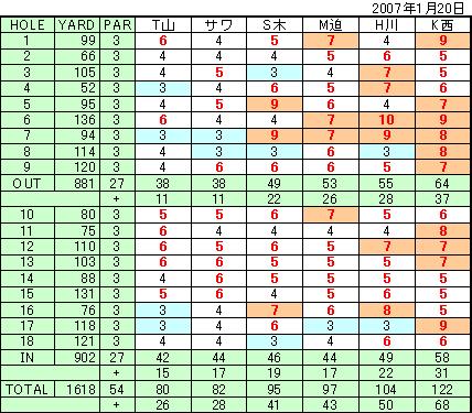 会社の仲間と行ってきました!ショートって言えば、約5年ぶりくらいじゃないでしょうか!?大学の頃は、けっこう行ってたんだけど、社会人になってからはほとんど行ってませんね。さて、今回の件は、会社の仲のいい上司が、去年の年末の飲み会で「ショートに行きたい!」って言ったのが始まりです。まぁ、おいらは乗り気ではなかったんだけど、付き合うことにしました。メンバーですが、素人を中心とした構成で組んだんですが・・・。見事に差が出ましたね。まぁ、トップの女の子は経験者なんですが、仲がいいし女の子もいないとねって事で参加してもらいました。本当なら、女の子をもう1名呼んでたんだけど、都合が付かなくって・・・。さて、おいらは今回2位でしたね。打ちっぱなしでは、ほとんどドライバーしか打ってないんですよね。しいて言えば、ココ3回程アイアンを練習しました。で、今週行ったのでコツを掴んで、約200球程度を打ち込んだだけですね。まぁ、まっすぐは行くし、ショート程度の距離の打ち分けくらいはマスターできましたね。それで、このスコアが出たのはスゴクない!?さて、プレーの後はみんなで食事に行きました!いやー、1組目のプレーは凄かったみたいです!組み分けは・・・。【1組目】:S木(仲のいい上司)・M迫・K西【2組目】:T山(女の子)・H川・サワで、そのプレー内容って・・・。2組目は普通のプレー・ルール・マナー・スコアだったんですよね。当然ですが・・・。で、1組目は・・・。・最大打数は9打・空振りOK・チョロOK・自己申告のOBあり・3打で特設ティーまで行かなければOB扱い・パット時にピンを抜かず、ピンに当てようとしていた等々・・・。ってな内容で、食事会は大盛り上がり!その上司が、春の社員旅行でショートに行きたいと言い出すほどの盛況でした!さて、次回の開催は4月の予定です。その時は、今回のメンバーと、桝・浦・吉を追加するかな・・・。もしかしたら、兼さんが来るかも!?との事・・・。裏話・・・。やっぱり、心は凍らせたくないんで・・・。
