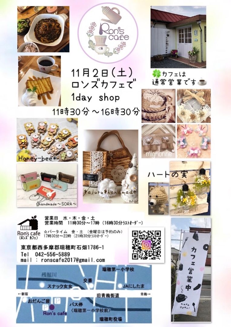 ✨ カフェの営業中にテラスでゆる〜く出展します✨✨ ・ 🍀#ロンズカフェ で 1day shop 11月2日(土)🕚11時30分~16時30分 今回はこのメンバーでまったりと出展します😊 handmade~SORA~ Honeyーbee*さん @marron_n8 ハートの実さん @weloveheartnomipktm ・ *ajuru*さん @ajuru.handmade mignonne*さん @mignonne_443 ・ ☕️ 🍽 ロンズカフェは通常営業中ですので、いつもの#美味しいランチ も#シフォンケーキ もありますよ✨✨ ・ Ron's cafe✨☕️ @ronscafe2017 営業日:水・木・金・土 営業時間:11時30分~17時00分 バータイム:(金・土)金曜日は予約のみ 17時30分~22時00分 (ラストオーダー21:30) 定休日:日・月・火 TEL:042-556-5889 mail:ronscafe2017@gmail.com 住所:東京都西多摩郡瑞穂町石畑1786-1 ・