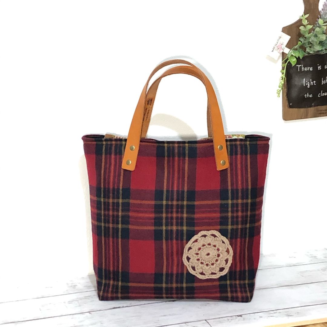 #ショルダー タイプの#トートバッグ 作りました✨😊✨ ・ 先日の#イベント 直前に出来たから出展中に撮影会(笑) ・ #秋冬 用の生地に#毛糸で編んだ #ドイリー を付けて#秋冬コーデ 🍀 モデルさんが可愛いんです😆