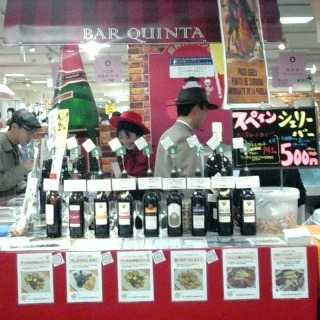 大阪・梅田の百貨店で、この季節恒例でしょうか、「阪神大ワイン祭」という催しがあり、北新地「BAR QUINTA(バル・キンタ)」のマスターが、白ワインの一種であるシェリーのブースを出されていたので覗いてきました。シェリーにはいろんな種類がありますが、無色に近いフィノやマンサニーリャ、色の濃いアモンティリャードやオロロソ、さらに濃くてまるで砂糖を入れた紅茶のようなモスカテルやペドロ・ヒメネスなど、多くのシェリーが1コイン(500円)均一で50cc飲めます。早い時間から2杯飲んだら、かなり回りました(^o^;)。 中央のハットをかぶった男性が、バル・キンタのマスター
