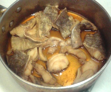 鱈は北の海で獲れる魚ですが、昔から関西でも食べていました。ただしそれは生の鱈ではなく、ひと塩の鱈、すき身鱈、棒鱈など加工したものばかりです。固い干物の棒鱈は、京都では京芋と一緒に煮いて「芋棒=いもぼう」という一品になります。大阪ではもっぱら正月の煮〆用の食材ですが、水を替えながら戻すのに1週間かかるという、えらく手のかかる食材です。それでも昔の人はこれを正月料理にしようと思ったんでしょう。美味しく思ったんでしょうね。わたしが子供の頃も、祖母や母は「面倒な」と言いながら、棒鱈を水で戻していました。棒鱈はそのうち値段が高騰して、わが家では食べなくなりました。わたしが結婚して以降も、棒鱈は長く省略していたのですが、ある年、ひと塩の鱈を煮いて代用してみると美味しかったので、それ以降は鍋用の鱈の切り身など、いろいろと工夫しながら煮〆に加えてきました。ここ数年は鱈のあらを買い、日持ちがするように濃いめの味で煮付けて、煮〆の一つとしています。当ブログの愛読者で2014年に亡くなられた<みず>さんが「父は棒鱈を摘むたびに、『♪割り木みたいなトト食べて…』と口ずさむのがクセでした」と書かれていました。棒鱈しかなかった時代ならいざ知らず、たぶん大正生まれのお父さまも「もっとうまい魚があるのに」と思われていたのでしょう。わたしがこのところ定番にしている鱈のあらは、しょうゆとみりんと水で煮きます。おろししょうがや粉山椒を加えるときもありますし、加えないときもあります。