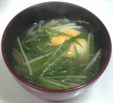わが家の雑煮は、元日と3日は典型的な関西の雑煮といわれる白味噌雑煮ですが、2日は水菜だけを具にした澄まし雑煮です。少なくともわたしが生まれた60年ほど前からずっと、2種類の雑煮を作っています。お正月に夫、妻それぞれの地方の雑煮を作る例はままあるかもしれませんが、わが家はそうではないようです。大阪ミナミの料理屋の主人が「大阪人は飽きっぽいから、3が日同じ雑煮では満足できない」とテレビで喋っていたのを聞いたことがあります。澄まし雑煮では、丸餅を焼きます。水菜を食べやすい長さに切り、ふだんと同じようにしょうゆ味の澄まし汁を作ったら、焼いた餅と水菜を加え、水菜がしんなりしたらできあがりです。水菜はハリハリした食感が大事なので、火を通しすぎないほうがいいでしょう。肝心なのは食べる際に「名ァが上がりますように」と唱えて、箸で水菜(菜ァ)を高く掲げてからいただくことです。単なる水菜入りの雑煮というだけでなく、この動作も含めてのお正月の儀式です。材料費のかからない安上がりな雑煮ですが、家族には好評です。煮〆が根菜中心の煮物で、雑煮も白味噌のまったりした汁物だと「重い感じ」がするところを、菜っ葉の入ったヘルシーな澄まし汁で気分転換が図れる、ということなのかもしれません。父はこの澄まし雑煮を「河内・大和の田舎の風習かもしれない」と言っていましたが、どうでしょう。わが家は大阪の町なかに長く住んでいて、七草粥の風習がありませんが、水菜の雑煮と関係があるのでしょうか?