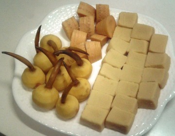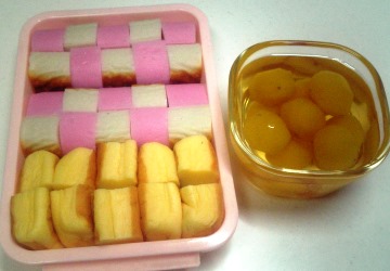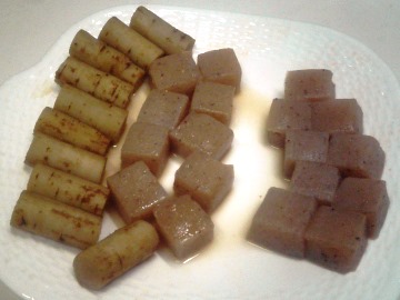 御節料理をわが家では煮〆と呼びますが、煮しめていないものもあります。今回の写真の3品とかずのこは、買ってきたものをせいぜい切って並べるだけです。かまぼこは、赤色の蒸しかまぼこと焼きかまぼこです。わたしが子供の頃は薄い半月切りでしたが、小田原のかまぼこ店でかまぼこを食べて以来、厚みを重視した切り方に変えました。黄色いのは「厚焼き」で、卵入りはんぺん、またはカステラかまぼことも呼ばれ、すり身を使った練り物に分類されます。ところで、御節料理には「言われ」が付き物と言われますが、厚焼きの言われは何でしょう。黒豆はまめに働く、れんこんは先が見通せる、などという「こじつけ」を勝手にありがたがっているだけで、わたしは昔の正月の時期に手に入る食材で作ったせいいっぱいのごちそうが御節料理だと思っています。「言われ」は信じませんし、馬鹿げているとさえ思います。厚焼きの「言われ」を説明してくださる方がどなたかおられれば、考えを改めるかもしれませんが。かまぼこも厚焼きも4人家族のときは3が日で計12切れあればよかったのですが、今年は9切れで済むことになりました。いちおう余裕を見て10切れにしています。あとは栗の甘露煮です。父は栗の甘露煮を「栗きんとん」と呼んでいましたが、もっと昔はさつまいもや栗を餡にしたきんとんを作っていたのかもしれません。ただ、わたしが子供の頃はもう栗の甘露煮でした。ここ数年は瓶詰でなく袋詰の栗を買っています。蜜は残しておいて蜜漬け芋に利用します。