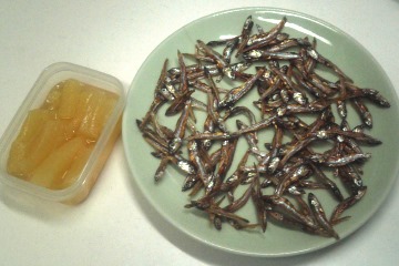 順に煮〆(わが家のおせち)を紹介してきて、残るはごまめとかずのこです。わたしが子供の頃は、かずのこは塩かずのこを何日もかけて塩抜きしていましたが、棒鱈と同様、価格高騰と同時に正月の食卓から消えました。わたしが所帯を持ってからも、立派な何腹もの塩かずのこは分不相応と考え、長らく省略してきましたが、最近は塩抜きをして調味液に漬けた「折れ子」の70gや90gのパックが並んでおり、売り切れていない限りそれを買うことにしています。高野豆腐に始まり鍋で煮く一連の野菜類や、切ったりして並べるだけの厚焼きやかずのこなどを除けば、別に調理するのは黒豆、棒鱈、そしてごまめです。ごまめ(田作り)も祝い肴としてはそこそこの地位があるようで、さすがは尾頭付きの魚ですね。比較的ピンとまっすぐに乾燥させたカタクチイワシの幼魚です。かつては素焼きの鍋「焙烙=ほうろく」で、今は油を引かないフライパンでいちばんの弱火で、菜箸でゆるく混ぜながら、気長にごまめを炒ります。火が弱いので、2匹くっついているものを手でつまみ上げて分離させられるほどです。炒ってカラッカラになったらいったん大皿に取り、フライパンに残る魚の粉を拭き取ります。ここへ炒ったごまめを戻し、充分に温まったらみりん20ccを振りかけてよく混ぜます。全体が乾けば大皿に広げ、冷めてから手でバラバラにほぐします。わたしは砂糖、しょうゆ、七味、ごま、青のりなどは使わず、ごまめ自体の塩分と、みりんでツヤを出すだけの一品にしています。