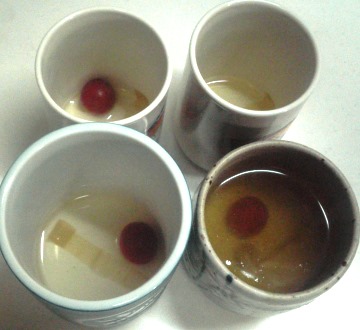御節料理(煮〆)はお正月独特のものではありますが、皇服茶または大福茶と書く「おおぶく茶」も同様です。正月3が日、家族全員が食卓に着いたら、家長が「お祝い!」と言って、みんなでおおぶく茶を飲み、そこから食事が始まります。おおぶく茶(父は「おんぶくのお茶」と言っていた)は「おおぶくの梅」と白昆布を入れたお茶です。わが家はカリカリした小梅と、鏡餅に飾る白昆布の端を人数分だけ細く切っておいたものを用意し、熱い煎茶を注ぎます。禅寺では朝に、お湯で梅干しを煮て少しの砂糖を加えた「梅湯=ばいとう」を飲みます。口中がすっきりするとのことですが、おおぶく茶も同じような効用があるかもしれません。こちらは梅干し+昆布+煎茶ですから、梅湯よりうまみがありそうです。梅の名所の京都・北野天満宮では年末におおぶくの梅を売り出します。おおぶく茶にはありがたい神様の霊力も加わっているに違いありません。ただし、わが家の梅は「甲州小梅」という単なるカリカリ梅ですが。子たちが小学生の頃に、3学期にそれぞれの家の正月行事を発表しあうことがあり、子たち2人はいずれも「うちの行事は珍しがられた」と言ってました。昔から大阪(市内)に住んでいて、その風習を守っているだけなんですが、おおぶく茶にしても、お正月に飲む家はどれぐらいあるのでしょうか。昆布の粉末に砕いた梅を混ぜた梅昆布茶は、お湯を注いで飲みます。煎茶で作るおおぶく茶は、行事ではなく、ふだんに飲んでもきっと美味しいだろうと思います。