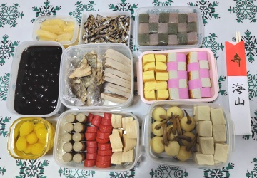 2025年、元日の食卓の煮〆です。買ってきたかまぼこ、厚焼き、かずのこ、栗の甘露煮以外は、すべて大晦日に作りました。「海山」と書かれた祝い箸の前から時計回りに「かまぼこ(焼き、紅)・厚焼き」「くわい・高野豆腐」「たけのこ・金時にんじん・ごぼう」「栗の甘露煮」「黒豆」「かずのこ」「ごまめ」「こんにゃく(二色)」、そして中央が「れんこん・鱈のあらの煮物(棒鱈の代用)」です。今年も冷蔵庫で保存するため重箱には詰めませんでした。1月16日に、このブログを始めて20年を迎えます。そろそろペースダウンしようと思いますが、その前にわが家の年中行事の中でも重要な正月の行事について、きちんと書き残しておこうと思っています。少なくともわたしが生まれた60年ほど前からほとんど変わらない煮〆です。かつての大阪の煮〆は、どこの家庭もこのような内容だったかもしれません。保存性を良くした魚の加工品と黒豆、高野豆腐で蛋白質を摂取し、あとはほとんど野菜の煮物ばかりですね。わたしが子供の時分には、かずのこが高騰したり、棒鱈を水で戻して煮るのがたいへんだったりして、それぞれ省略した年もありました。当時の黒豆は硬く煮締まった感じでしたが、わたしが作るようになってから「土井勝の黒豆」の煮き方で、しかもできるだけ大粒の豆を手に入れて作ることから、ふっくらとした軟らかい黒豆になりました。こんにゃくを2色にしたのも、わたしの遊び心からです。それぞれについては、おいおい細かく書いていこうと思います。