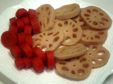 さて、たけのこのお次はれんこんです。ごぼう(たたきごぼう)と同じく酢れんこんにするおうちもあるでしょうが、わが家は輪切りにして煮きます。もちろん、たけのこの煮汁を引き継ぎ、うすくちしょうゆで少し味を濃くします。このれんこん、年によって当たり外れがあり、産地なのか品種なのか、繊維がきつくてバシバシのものもあれば、でんぷん分が多くてもっちりした煮き上がりになるものもあります。徳島産が比較的当たりが多いように感じています。その次は金時にんじんです。皮むき器で皮をむき、輪切りにして煮ます。洋にんじんがオレンジ色なのに対して、正月の時期に出回る金時にんじんは鮮やかな赤色です。煮いた食感は洋にんじんより軟らかいです。ここ数年の工夫として、金時にんじんを煮くときに、次に煮くこんにゃくの半量を加えて一緒に煮くことにしています。これは、ぜひそうするべきだというほどのものではありませんが、次に煮くごぼうとの比較実験のようなもので、ほんの遊び心です。