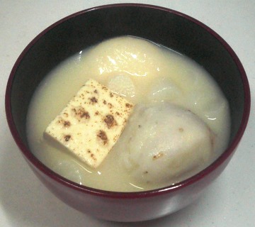 お正月の食卓には、煮〆(御節料理)のほかにおおぶく茶、屠蘇、そして雑煮が並びます。わが家は元日と3日が白味噌雑煮です。これは宮中で食べられていた白一色の雑煮が元になっています。材料は焼かない丸餅、小芋(里芋)、雑煮大根、焼き豆腐、白味噌(西京味噌)です。京都では里芋の「かしら芋」が好まれるようですが、大阪では小芋を使います。白くて丸い材料ばかりで、焼き豆腐だけ例外ですが、昔は日もちを考えれば仕方がなかったのでしょう。小芋は600Wの電子レンジで皮ごと100gあたり2分加熱し、すぐ冷水に取って皮をむきます。雑煮大根(細い大根)は皮をむいて輪切りにします。これらと焼き豆腐をかつおだしで煮て、下ごしらえしておきます。元日と3日はこれの半量に必要ならば水を加えて煮直して、白味噌を溶き、最後に丸餅を加えて餅が浮き上がってくるまで煮ます。子供の頃は母に「お餅、何個?」と訊かれましたが、今はわたしが家族に確認します。たいてい返事は分かっていますが。甘みが強い白味噌(西京味噌)ですが、ふだん味噌汁を作るときの合わせ味噌よりも倍ほど使わないと、まったりとしたコクが出ません。餅は煮えて軟らかくなり、かつ溶けない程度に煮ます。餅が多い人はひと椀でよそい切れませんのでお代わり(2杯目)を用意しますが、火をつけっぱなしにすると餅が溶けてしまいます。3が日の雑煮を大鍋で一度に作り、毎日餅を足して煮直す家もありますが、わが家は毎日新たに作ります。そして、2日は澄まし雑煮です。