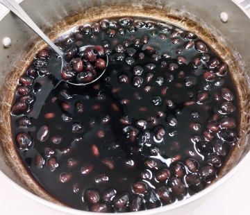 御節料理の原型とされる「3種の祝い肴」は、黒豆、かずのこと、もう1品はごまめだったりたたきごぼうだったりするようです。黒豆というのは黒大豆の煮豆のことですが、昔から赤米や黒米を混ぜて炊いた色付きごはんは霊力があると思われていたせいか、黒豆も特別な食べ物だったのでしょう。これまでは250gや300gの黒豆を煮いてきましたが、今回は150gの極大粒の豆が手に入ったので、砂糖や煮汁もそれに合わせて調整し、上手に煮くことができました。丹波の黒豆は、2Lを特大粒、3Lを極大粒や飛切級と呼ぶそうです。これまでは飛切級にこだわって入手し、煮いてきましたが、年によっては3Lのなかで飛切級が設定されない年もあるようで、ならば極大粒でいいかと考えを改めました。基本は「水は豆の重さの6倍、砂糖は豆の8割」です。今回で言うと水は900cc、砂糖は120gになります。ほかに必要なのは小さじ1杯の重曹だけで、さびた釘や塩・しょうゆは用意しません。それでも軟らかく煮けます。煮き方は「土井勝の黒豆」の手法で、砂糖を加えた水を沸かし、重曹を加えたら、すぐさま洗った豆を投入して火を切り、ふたをして一晩置きます。翌日は6~8時間かけて、豆が水面から顔を出すまで、ひたすらとろ火で煮続けたら(水分を蒸発させて煮汁の砂糖分を濃くしたら)できあがりです。写真は煮終わった直後ですが、この時点ではまだ豆が粉っぽい食感です。これを一晩、煮汁に浸しておくと、ふっくらつやつやとした軟らかい黒豆ができあがります。