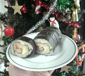 薄味で煮たにんじん、卵焼き、きゅうりを細く切り、ビュッシュ(薪)の随所