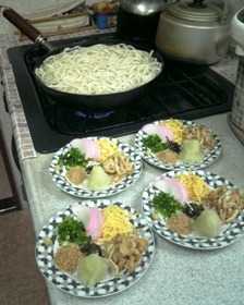 で、あふれそうになりました)。具と薬味は、ピンクのかまぼこから時計回り