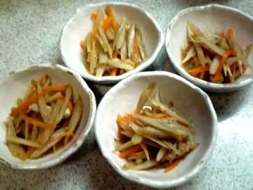 ぼうで作るように、薄いささがきにして、濃い味付けの きんぴらごぼう にして