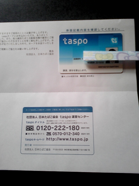 昨日の出来事職場がミョ~に騒がしいなに覗いてみると、知らないお兄さんやらおじさんやら・・・・・テーブルを出してノボリを立て・・・・どうやら話題のTASPO手続きにやってきたらしいはて、どうやって手続きをするのだということで聞きに行ってみたワケだするとおじさま。親切っちゅーかなんちゅーかほんじゃ、第1発目 って写真を撮ってくれたんですが・・・・・みごとにプードルみたいに写った自分の顔その後、あーしろこーしろと親切に教えてくれて同じ課のおっちゃんに免許証をコピってもらい・・・・あっという間に手続き完了~ポストに投函して終わり2週間後にはカードが来るらしいけど・・・・・・愛煙家にとってはずいぶん過酷な状態になってきてますね未成年の喫煙防止とかいや~、あの手この手で来るんでしょうからね~てか、自販機で買えなくなる時代が来るなんてだけどね。このカードたばこを吸わない人ももってるといいかも。もしも、誰かに「たばこ買ってきて」なんて頼まれた場合店の中にわざわざ入らないと買えないこれは面倒だカードを作るのが面倒で『たばこやめるから作らない』なんて人も居たけど・・・・・・・・・ だったら、もっと早く止めろぉ~~ って言いたかったわ
