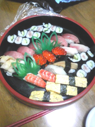 我が家のお嬢様めでたく、24歳になりましたお嬢が二日酔いのため、ディナーもキャンセルされ・・・・気力を失った私はケーキ作りも中途半端のまま・・・・・あっけなく日付は変わり・・・・・27日なった3時の出来事そ~~っと、部屋のドアが開く。起きていた私・・・・(寝ようと布団には入ってたんだけどね)『ママぁ~、お客さんから寿司もらったから食べようよぉ~』┓( ̄ー ̄)┏・・・おなかイッパイですが・・・・と、見せられたのが・・・これです・・・・でかっこれを二人で無理です・・・・が、せっかくなのでいただきましょ~~~うって、分かります すでにエビちゃんがひとつ無いァ '`,、'`,、'`,、'`,、(´▽`) '`,、'`,、'`,、'`,、'`,、犯人は、私です3つほど食べて「ごちそうさまぁ~」下のお嬢をメールで呼びます『早く帰宅せよ 寿司がある・・・・』と、メールだけして、私は就寝・・・・あ ひまわりが好き~とお客様に言ってたお嬢。当然、プレゼントは・・・・・とこれ言うまでもありません私が布団に入ると、あっという間に下のお嬢が帰宅姉妹揃って、なにやら話しておりますお寿司をつまんでいたんでしょうねホンワリとした気持ちで眠りに・・・・あ~、私だけ。いい誕生日