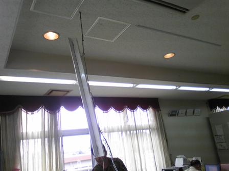 朝、出勤すると・・・・・・・・・天井からつるされていた電気が・・・・・ベローンどうやら夜中に落ちたらしいおいおい、人が居なくてよかったよ絶対にけが人が出てたと思うそしてこの電気2列になってたものが落ちちゃったわけで・・・・ショートヘアの彼女は直撃を受けたはずそして私のデスクの上では・・・・・ブラブラとぶるさがっているのでありましたあ~、みんなが無事でよかったぁ~早朝、7時40分の激写(瞬間は撮れなかったけどね)危ない危ない