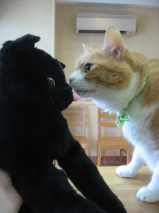 蝉丸作の招き猫さんとshadyとjeraを撮ったシェイディーは慣れたものでちゃっちゃと並んで、カメラ目線にポージングとかってにやってくれるジェラたんは作品と一緒に撮影など初だったため「おっこれは何ですか?遊んでもいいんですか?」と舐めたりかじったりしようとするため、かあちゃんに怒られたそして微妙な距離に・・・でもちゃんとお利口に出来た後にはご褒美をもらえて満足気でした