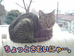 干されたままのベランダのお布団の上で座ったけど、やっぱりお日様がいないと寒いにゃ。