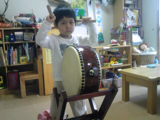 4歳の次男くんは小さい赤ちゃんのころからなぜか太鼓が大好き♪何でもかんでも太鼓に見立ててパカパカと叩くので確か2歳のクリスマスプレゼントで最初に買ってあげた太鼓はキッズパーカッションシリーズのキッズわだいこまあ、それはそれは買ったのを後悔するくらい(うるさくて)よく叩いておりました。 で、私の父も和太鼓をやるので実家には大きな太鼓もあるのですが帰省するたびに次男があまりにも夢中になるので(小さな子が手にできた豆がつぶれるくらいにやるのです)父が手作りでバチを作ってくれたのがこれまた彼をエスカレートさせとうとうプレゼントしたおもちゃの太鼓はあえなくやぶれ・・・(涙)で、3歳の誕生日には親ばかっぷりを発揮して小さくてお手頃価格のこちらの1尺の平太鼓をプレゼントいたしました。しかし、我が家は賃貸の集合住宅暮らし。のびのびと和太鼓をたたかせてやれるような豪邸ではないので普段は毛布でカバーをし防音をしてなんとかしのぎお休みの日の昼間、時間を決めて窓を閉め切りカバーを外して叩く、という状況です。最初のころはそれはそれは熱心に叩いていましたが最近あんまり興味を示さなくなってました。というか、他にもいろんなことに興味が向くようになったのかな。ところが先日、でんちゃんの公演に行ってからまた太鼓熱が復活。昨日、私のお休みに合わせ次男くんも保育園を休んだのですが昼間、かなりの時間、みずからかけたCDの歌に合わせて和太鼓をたたく次男くん。なぜか、合間に決めのポーズ(ヒーローみたいな)をとり踊るようにしてやたらにバチを振り回し眉間にしわを寄せて怖い顔をして太鼓を叩きます。どうも、勇ましくカッコよく叩きたい願望が強い様です。カメラを向けるとこんな顔。これ、不機嫌なのではなくて決めてるつもりと思われます[笑)そんなこんなでもう少し大きくなったら太鼓を習わせてあげたいな~と思ってはいたのですがこのたび、でん舎のでんちゃんとご縁があって近所でお試し単発講座をお願い出来ることになりました。もし、和太鼓大好き♪とか初めてだけど体験してみたい♪なんて方がいればぜひ、ご一緒しませんか?以下、ご案内です。@@@@@@@@@@@@@@@@@@@@@@@@@@@@@@@@おやこ和太鼓体験教室 in 板橋区蓮根和太鼓は思いっきり叩くととても気持ちのいい楽器です。今回は体験教室として「太鼓で遊ぶ」ことを中心に、かんたんな曲の演奏まで行います。子供だけでなく大人の方も参加可能です。夏のひと時、思いっきり汗をかいて楽しく過ごしましょう!●日時 7月18日(日)10:00~11:30●会場 蓮根地域センター音楽室 志村第六小・城北公園となり●参加費 1500円(当日集金)●対象 3歳児~大人 未就学児は必ず保護者同伴でご参加ください (保護者は参加でも見学のみでも可)●持ち物 着替え・タオル・水分 *道具は貸し出しますが、バチなどをお持ちの方はご持参ください。 *会場の都合上引率の保護者以外の見学はご遠慮ください。 *講習中のビデオ、カメラ撮影はご遠慮ください。 終了後の記念撮影はOKです●主催 みどり会●お申込み/お問い合わせ 改田(かいでん)050-3338-5606 / info@densya.main.jp でん舎HPより 又は こちらのブログへのコメントやメッセージでもお受けします大人も参加できる機会なんてなかなかありませんのでぜひ親子で参加、ご検討くださいね♪