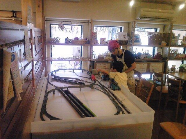今日は午前中、子供らが楽しみにしていた公演に行ってきました。昨年まで保育園でお世話になっていた先生が退職し独立?され活動されている「でん舎」が主催する公演「でんちゃんの打ち(ぶち)がたり」です。特に次男君は元々和太鼓大好きなうえに担任をしていただいたこともある先生なので「先生に会える、先生に会える♪」「先生のひとり舞台はいつ~?あと、いくつ寝たら?」」と先月から聞かれ、「え~っと、いくつ寝たらかな? ひとつ、ふたつ・・・」と一緒に数えてたくらい(笑)実は次男くん、昨夜急な発熱で39度近い熱が出てしまいこれはちょっと無理かな・・・と思っていたのですが今朝は熱も37度台(ただし後半)本調子ではなかったのですが元気だしとにかく楽しみにしていたのでえ~い、行っちゃいますか!となって出かけてしまった次第で。公演はお客さんが10数名のアットホームな雰囲気。会場が音楽室ということもあってすごく演じるでんちゃんとお客様が近い感じ。さすが保育園での先生経験が活きてまして子供らも集中して楽しんでおりました。所々でたたかれる和太鼓の音色と腹からでる迫力あるでんちゃんの声。やさしいわらべ歌のリズム。最後の方に獅子舞のお話に続いて大迫力の獅子舞。短い時間でしたがとっても楽しいひと時でした。行きの移動中は今一つ活気のなかった次男くんも帰り道は別人のように元気いっぱい。「楽しかった~」と気持ちが満たされて体も喜んでるような感じのはしゃぎっぷりで帰り道は走る走る走りまわる!!一緒に帰ったお友達と長男と3人でとにかく楽しそうで笑いが絶えず声も高い。しまいには気持ちがたかぶってか?ヒーローのポーズをとりながら道路ででんぐり返し!!を何度も繰り返し、みているこちらは最初はびっくりでしたがそのうち大笑いしながら後ろをついていきました。そして、その後はお友達と別れて旦那のお店はぴくすでランチ。最近鉄道模型にはまっている長男くんと旦那。とうとうお店が子鉄カフェとなってしまっていました・・・いや~、これ、どうなんでしょ??好きな人にはたまらない、でしょうが私としては「まったくもう・・・」と半ばあきれ気味。でも、息子らは大興奮でしたが。きっと小さなお子様には無理ですがお好きなお子様、小学生くらいからですかね、ぜひぜひ遊びに、いや、旦那の趣味に付き合いに来てやってください♪ちなみに、次男の熱はすっかり下がりました。楽しみにしていた先生の公演がお薬になったようです。さすがに疲れて夕方から爆睡でびくともしませんがこんな日がたまにはあってもいいですよね。