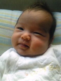 今日も日差しが暖かくて窓辺にいるとぬくぬくといい気分です♪我が家の娘も気づくと2カ月を過ぎここ数日、急に笑顔を見せてくれることが多くなってきました。新生児期の眠り際に見せる顔の反射のような笑顔と違いしっかりとこちらを見つめて何かを伝えようとするかのように「にこっ」と表情を変えるのです。「かわいい~♪」3人目だしそんな事慣れてるはずですがやっぱり可愛いものは可愛いのです。思わずこちらの目じりは下がり気持ちはほんわか。かける声のトーンまで上がってしまう親バカな私。赤ちゃんってすごいです。ちょっとしたことで皆を幸せな気分にさせてしまいます。私が同じように笑っても多分こうはいきません。っていうか、きっと気味悪がられるかも(苦笑)表情が豊かになった2ヶ月の娘の顔はまさに百面相。ちょっとした眉や目の動きで全く違う表情になるんですよね。この笑顔をカメラにおさめようとトライするもののこの一瞬の「にこっ」がなかなか撮れなくって。う~ん。携帯のカメラでは無理がありますが・・・↓そして泣くときも豪快でこれまた可愛いのです♪泣いてるのに抱っこせずに思わずパシャっ。ごめん、ごめん。ちょっと親バカな報告でした。