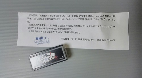 裁判長!「おなか空きました!」DVD購入して応募してたんです~忘れてましたけど・・ ポスト見たら 「バップ」の名の封筒が ん?何?当たったんだ!!これ 何に使おう・・・考えてみたけど 普通に使えるところ無いじゃん!!で~ いつも出品させて頂いてる楽オクで商品出荷の封筒の裏に ポチッと 押しておこうかな!と 捨てられるけど・・ 見るだけでも喜んでもらえるとうれしいから!どうこのアイデア!! このブログ知らないで落札した方は なんなの?って思うかもしれないけど~キスマイファン 特に キタミツファンには 分かってもらえるんじゃないかな!今出品してるものが落札されたら開始します!いらないと言っても 押しておきます!(笑)