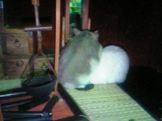 すっかり工場をお休みしてしまいましたm(_ _)m 3月6日の未明にテラが、3月11日の深夜にテンが息をひきとりました。アポロ達と同じ病気でした。テラは一度発病しかけておりましたが、アポロ他界の後治っていたので、もう大丈夫だと思っていただけに、かなりのショックでした。テンもテラの発病後すぐに発病しました。テラとテンはとにかく仲良しでした。鏡を見るのも一緒、鍋をひっくり返すのも一緒・・・。元々は三姉妹で暮らしておりましたが、ムーンはアポロ譲りのバトルな娘だったので、早々に一人暮らしをしておりました。どうやらテラがお姉ちゃんだったらしく、いつもテンの面倒をみてくれてました。ちょっと鈍くて甘えん坊で我がままなテンはいつもテラに甘えてました。テラが何かを食べていると口元から奪い取ってしまったり、エサ入れに入ってエサを独り占めしたり、寝ているところをひっくり返したり、上に乗っかったり・・・といろんなことをしていたけど、テラがテンを怒っているところは見た事がありませんでした。↑こんなことは日常茶飯事でした。決してテラが弱虫で臆病な子だった訳ではないのですが、(他のハムに対してはアポロ並にバトルな子でした)テンのやることは全て大目に見てくれる優しいお姉ちゃんでした。発病後すぐ二人を離そうとしたのですが、テンがテラから離れようとしませんでした。自分も発病して辛いはずなのに、ずっとずっとテラの毛づくろいをしてました。ホントにホントに仲良しで見ているこちらがいつも微笑んでしまうほどでした。テラとテンが逝ってしまい、工場長この度は落ち込みが激しく、なかなか立ち直れませんでした。でも、今頃きっとテラとテンはむこうでも仲良くしていることでしょう。だから工場長も頑張っていこうと思います。テラちゃん、テンちゃんたくさんの癒しをありがとう。