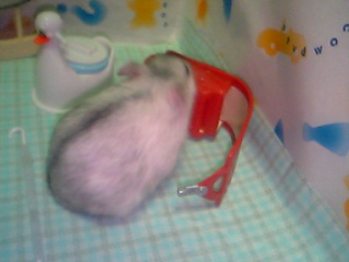 今日はと~~~ってもいいお天気でした。お部屋の中の気温がかなり上がってしまい、暑いくらいの日中でした。ハムちゃん達も暑かったらしく、可愛い野良寝姿があちらこちらにみられました。かわいいなぁ~(・∀・) と親バカまるだしでハム達のケージを次々見ていたら・・・。(´・ωゞ)・・・なんじゃこりゃ?上から、イノのケージから目が離せなくなっちゃいました(0_0)イノよほど暑かったのでしょうか?なんと回し車の上で寝ておりました。後ろから、下側から、頭側から、おしり側から、ちょっと離れて、イノとっても熟睡しておりました。暑くて回し車の中で寝ている姿は何度か目にしたことはあるけれど、回し車の上で寝ている姿は初めてみました。手や足をケージに引っ掛けて回し車が回らないようにして寝ておりました。イノのバランス感覚はかなりのものみたいです。イノの新たなる特技を発見できた今日なのでした。