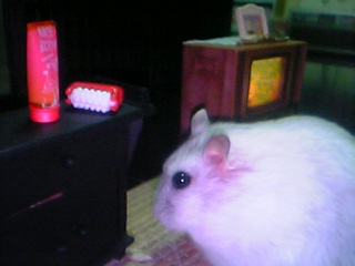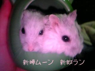 今日もよいお天気でした外はすっかり春の陽気で、裏庭の梅の花もピンク色のつぼみが膨らみはじめました。春休みでお友達と外で元気いっぱいに遊ぶ三男の声が聞こえてました。三男 「んじゃ~かぞえるよ~!10、9、8、7、・・・。」何故かカウントダウンする三男。三男 「・・・6,5、4、3、2、1、2、3、4、・・・」お友達 「三男君、なんか増えてるよ。」三男 「あれ?・・・」・・・(゚∀゚;) 三男、自分で気がつけよ!・・・と、言う三男のことはおいといて(ノ ゚Д゚)ノ我が家は家の中にも春がやってきております。アポロとサファイアの娘ムーンと、チョコとルナの息子ランがこの度結婚いたしました3月の頭頃から交際をはじめまして、同居して10日が経ちました。超人見知りで攻撃的のサファイアを父に持ち、三度の飯より戦いが好きなアポロを母に持つ、メチャメチャ母似のムーンはウルトラスーパーなバトルっ娘だったので、こりゃ~ムーンの旦那さんになれるのはスーパーサイヤ人のハムしかいないだろ~な!と思うほどでした。一方おっとり、ゆったり、もっさりのルナ殿様を父に持ち、おっとり、ゆったりしているけど戦えばそれなりに強いチョコを母に持つランは、おっとりしているけどそれなりに頑張れる息子に育ちました。一時期我が家のハムの体重部門で最高記録の88グラムを記録したことのある(もはやジャンガリアンの体重ではない)スーパーおデブだったのですが、ムーンと交際し始めてからダイエットに成功しまして今は76グラムにまで痩せました。お互いに過去に何度かお見合いをさせたことがありましたが、大抵はムーンが一方的にやっつける!と言う結果でしたが、この度は、何が良かったのか?めでたい運びと相成りまして、幸せな結婚生活を送っております。とにかく、何処へ行くのも、何をするにもランがムーンにピッタリとくっ付いております。次男が作っていたルナのエサを強奪する時も、次男が作っていたテトのエサを盗み食いする時も、次男が作っていた神楽のエサを横取りする時も、とにかく一緒です。ちょっとちょっかいを出すと、ラン「ムーンたんは僕が守るでしゅ!」と言う感じでございます(^^;)ラン ムーン 「近くに来たときには是非我が家にもお立ち寄りくだしゃい!」