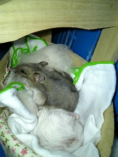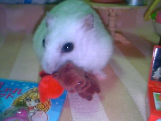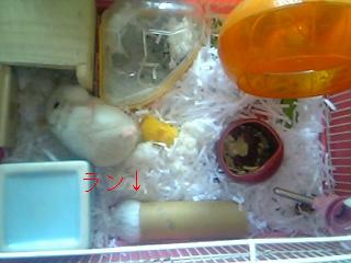 最近三兄弟にPCを乗っ取られております。長男、次男は以前からよく使っておりましたが、最近は三男まで何やら調べ物をしているようです。・・・何をしているのだろう?・・・と不思議に思っていたら、あちらこちらにメモ用紙が落ちていました。 カレーライス・・・カレー粉、おにぎり、雑草 (^^;)あ? シチュー・・・バター、牛乳、雑草 (-_-;)え~っと料理レシピかと思ったのですが・・・黒魔術か闇鍋のレシピかもしれない・・・。 昨日の朝、かなり早い時間にチョコが珍しく大暴れ?をしました。チョコ普段はとってもおっとりで騒ぐことなんてありません。そのチョコが、ケージの戸をガジガジ齧り、ガタガタと大きな音をたてておりました。晴の顔のすぐ横にケージがあるので寝坊の王者の晴もさすがに目を覚ましました。何事かと思いチョコのケージの中を覗いたら、サンが苦しそうにもがいておりました。慌ててサンを抱き上げてみたら、左足に綿が絡まっておりました。かなりねじれていてサンの足を締め付けていました。急いでハサミを取り出し切り取ろうとしましたが、ハサミでも切れないほどにかたくなっておりました。締め付けられたせいか、サンの足は腫れあがって色も変わり始めておりました。急いで爪切りを探してきて、足の近くで綿を切り、ねじれた部分をゆっくりとほぐしていったら何とか綿がサンの足からはずれました。発見が早かったからでしょうか、大事には至らず、夕方にはサンの足の腫れも無事元にもどりました。 ・・・もしチョコが騒がなかったら、サンの足は良くて骨折、最悪の場合は千切れていたかもしれません。その日一日チョコはサンに付き添うかのように一緒に過ごしておりました。(いつも昼間は晴がサンの面倒を見て、チョコが休むので離しております)チョコ 「今日は一緒に寝てあげるでちゅ。」そして夜もいつもは自分の寝床へ行って寝ているチョコがサンの寝床に一緒に寝ておりました。チョコがサンの危機を教えるために晴を起こしたのか、それともただ暴れてみたかっただけなのかはわかりませんが、チョコには感謝しても感謝し足りないほどです。 サン、またチョコに助けられたね?サン 「ん?何でしゅか?いまクコの実食べてるでしゅ!」サン 「クコの実食べるとあちこち赤くなっちゃうでしゅ。」 ・・・(^^;)サンは今日も幸せそうです・・・サンが幸せだと晴れも幸せになるのでチョコに何度もお礼をしました。チョコ 「ここを齧ると誉められるでちゅね!」ケージを齧るとおやつがもらえると思ったらしいチョコ。・・・ちょっと勘違いをしているようです(^^;)でもチョコちゃんありがとう。 前回の『ウォー○ー福娘をさがせ』の答えはこれ↓です。皆さん、区別がついたでしょか?・・・晴も区別がよくついておりませんが(^^;)ついでにもう1つ問題です。これは↓ランのケージ内です。ランはどこにいるでしょう?どうぞ、お暇があったらさがしてみてくだい(^^)