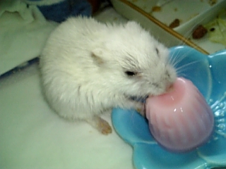 13日の日曜日、お日様が沈む頃にサンが息をひきとりました。12月におこしたひきつけのすぐ後はすっかりと弱ってしまい、すぐにも逝ってしまいそうだったのですが、「スタミノン」を食べるようになり少し回復しておりました。2日間はほとんどを寝床で眠ってすごし、1日は朝から元気に起きて駆け回るという生活をしておりました。固い物は食べれなくなってしまいましたが、「スタミノン」や蒸しカボチャ、お薬入りのペレット団子を主食にし、ゼリーやすり潰したカシュナッツなど食べ、水を飲めなくなっていたのでリンゴやミカンなどから水分をとっておりました。サン 「このゼリーは僕のでしゅよ!」野菜は柔らかく茹でたブロッコリーを好んでよく食べてくれました。サン 「むむむむ~!」サン 「チョコママのブロッコリーも僕が食べちゃうでしゅ~!」前回の日記を書いた日は起きて遊ぶ日だったのですが、全然起きてくれません。また具合が悪くなった?と思ったのですが、とても気持ち良さそうにスヤスヤと眠っているだけでした。いつもは寝ていても「スタミノン」は食べてくれていたのに、抱っこして食べさせようとすると眠ったまま両手を口の前に持ってきてイヤイヤをして食べてくれませんでした。仕方が無いので液体の栄養剤を無理に口に1滴入れてあげたのですが、オエッ!となってしまい危険なので無理に飲ませることも出来ませんでした。その晩はずーーっとサンの様子を見ておりましたが、意識不明と言う感じでもなく、時折両手で鼻の辺りをクシュクシュするだけで、本当に気持ち良さそうにスヤスヤと眠っているだけでした。朝方ちょっとウトウトし、慌ててサンを見たら・・・チョコがサンをお腹の下に抱いて寝ておりました。まるで授乳でもしそうな感じでした。それでもサンはただひたすら気持ち良さそうに眠っているだけでした。チョコをサンの上から何度もどけても、チョコはサンを上から抱くようにして離れませんでした。三兄弟のお昼ご飯を用意して戻ってきたら、サンのお顔のそばにふやかしペレットが運んでありました。どうやらサンに食べさせようとチョコが運んだようでした。そして夕方、サンが目を覚ましました。いつものサンの穏やかなお顔をしておりました。喜んで「スタミノン」をあげようとしましたがイヤイヤして食べてくれませんでした。サンは晴の手の上でお顔を洗った後、きょろきょろとし始めました。何故か「チョコを探している?」と思い、チョコも一緒に手のひらに乗せました。チョコはしばらくサンを見つめるとサンのお顔をぺろぺろと舐め始めました。サンもチョコのお顔を舐め返しておりました。そして、サンが右手を上げてきたので、晴は握手するように親指と人差し指でつかみました。この時不思議とサンが笑ったように見えました。その後2度しゃっくりをしたサンは静かに穏やかに眠り始めました。そしてそのまま逝ってしまいました。穏やかに苦しそうな顔をすることなく静かに静かに眠りにつきました。 去年の8月から4ヶ月以上の闘病生活を終えてサンは安らかに逝くことができました。何度もひきつけをおこしたり、出来物ができて破れたり、足が無くなったりといっぱい苦しい思いをしてきたサンでしたが、最後のひきつけ以降は本当に穏やかに楽しく暮らせました。お正月の日はあまりの元気さに2畳のホットカーッペットを飛び越えてフローリングの床にまではみ出して駆け回るほどの勢いでしたし、「スタミノン」のおかげで食欲も回復して体全部を使ってカボチャまみれになって食べるほどの食欲ぶりでした。晴のサンへの最後の最後の願いは苦しまずに終わりを迎えることでしたので、サンがいなくなって悲しいですが、なんだかホッとしたような悲しさとでも言ったら良いのでしょうか?(こんな日本語無いと思うけど)正直言えばもっともっともっといっぱいいっぱい長生きしてほしかったですけどね・・・。サンのお墓は三兄弟が揃って作ってくれました。サンの取れてしまった足を冷凍保存しておいたので一緒にお墓に入れてあげました。きっと今頃はお空の上で、足もくっ付いて丈夫な足になり、元気に回し車を回していることでしょう。昨日ご報告をしようと思っていたのですが、サンの今までの事を読み返したり、写真を見ていたりしてすっかり時間がなくなってしまいました。赤ちゃんの頃からちょっとドジで小さい男の子でした。いつも間が抜けていて、女の子のハム達にも男の子として見られてませんでした。サン 「ん?今僕のことなんか言ったでしゅか?」サン 「みなしゃん、僕はちょっとだけどネズミが主役の子年を 楽しく穏やかに精一杯生きたでしゅよ! みなしゃんが僕が元気に年を越せたことを喜んでくれて、 僕はとっても嬉しくってあったかい気持ちになったでしゅよ! いままでいっぱい僕のことを応援してくれてありがとうでしゅ!」 僕はみんな、み~んなだいしゅきでしゅ~」 サンお空には本当のマ