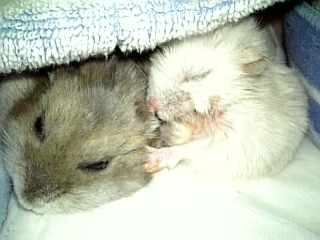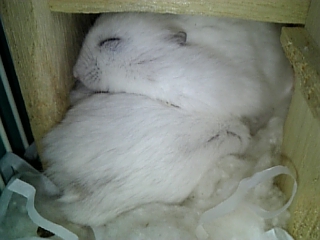 サンが旅立ってから急に暇な時間ができてしまい、チョコ共々ぼーーーっとしてしまっている今日この頃です(-o-)今更ながらですが、今年のお正月にちょっと驚いたことがあります。 普段は夜更かしのせいでいつも寝不足の長男なのですが、三が日を毎日20時間くらい寝倒してました。その結果・・・毎日見ている晴がハッキリと分かるほどに背が伸びておりました。150センチに満たなかった身長がほんの3日ほどで157センチまで伸びておりました。・・・まさしく寝る子は育つ!な長男のお正月なのでした(o_o;)真面目にビビリましたよそしてこちらにも寝る子が・・・テトとランです。最近めっきりと寒さが増したせいでしょうか、毎日毎日テトがランを布団代わりにして寝ております。基本はランが敷布団もしくは枕代わりです(^^;)たまにランが上に乗ったりするとテトが全身を使ってドロップキックして跳ね除けるからです(^^;)テト 「この体勢が基本でちゅわ!」たまにテト一人で寝ていると寒そうに見えます。最近、お年のせいかやせ細ってきていたテトですが、「スタミノン」と、よく眠るおかげで再び育って?きております。 テト、一番育ったところ見せて(^^)テト 「なんでちゅの?テトのどこがそんなに育ったでちゅの?」テト 「レディーに向かって育っただなんて失礼でちゅわ」 ごらんの通りテト姫様ほっぺたがお育ちあそばして「おたふく顔」になりました(^^;)ランもテトの「スタミノン」を盗み食いするようになり、体重が元に戻ってしまいました(^^;)また我が家の横綱に逆戻りです。が、ランの左目を見てください!「スタミノン」を食べ始めてから毛が一気に伸び始め、変な癖毛がなくなってもとのおめめに戻りました(^0^)おかげで目薬&晴のへたくそなカットが不要になりました。ラン 「おかげで、安心してもっと大きく育てるでしゅ!」 ・・・ランそれ以上育ったらジャンガリアンじゃなくなるぞ!(^^;)
