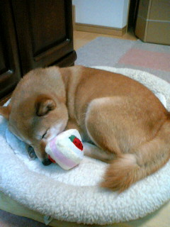 だ~ぃぴょんさんからのプレゼントのケーキのおもちゃでもっと遊びたかったけど、起きていられないんでしゅ…ぐーー。byはる