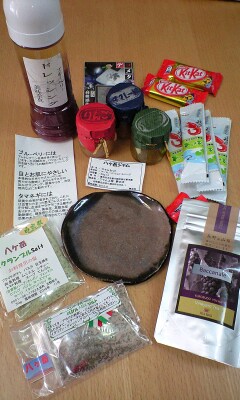 わさび味のえびせんに、一味唐辛子ティストのキットカットに、目によさそうなブルーベリードレッシングに、ブドウの葉のお茶に、ハーブの入ったお塩に、かわいいジャムのセット。