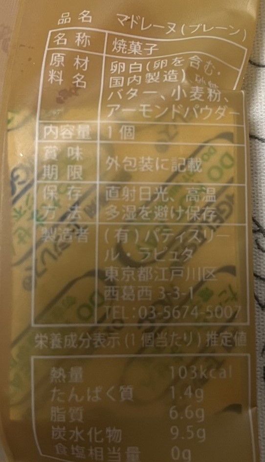 1個あたり103キロカロリーとマドレーヌにしては低いのでは?