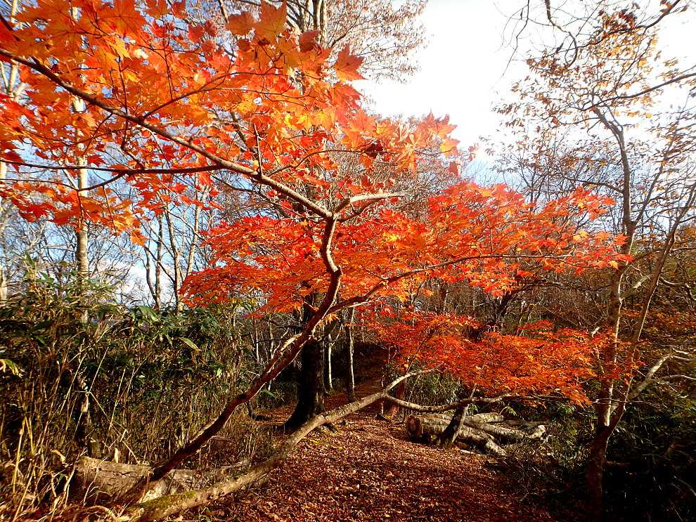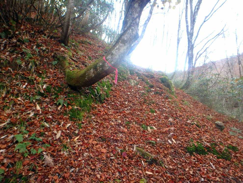 【登山道が落ち葉に隠されて迷いやすいところ。テープが唯一の頼り】