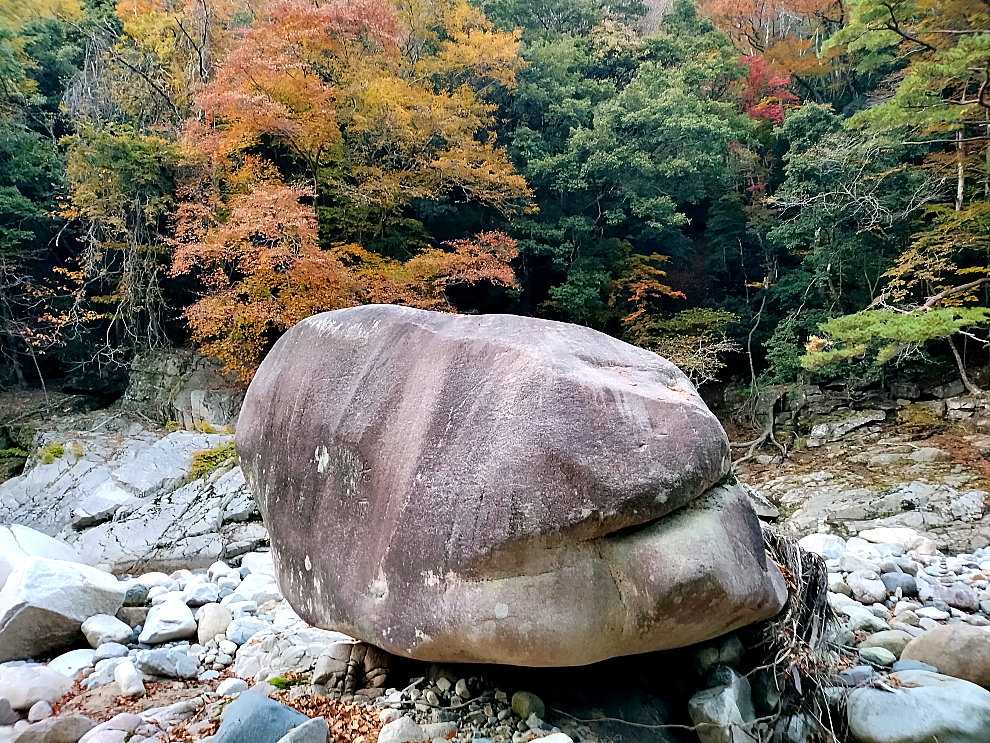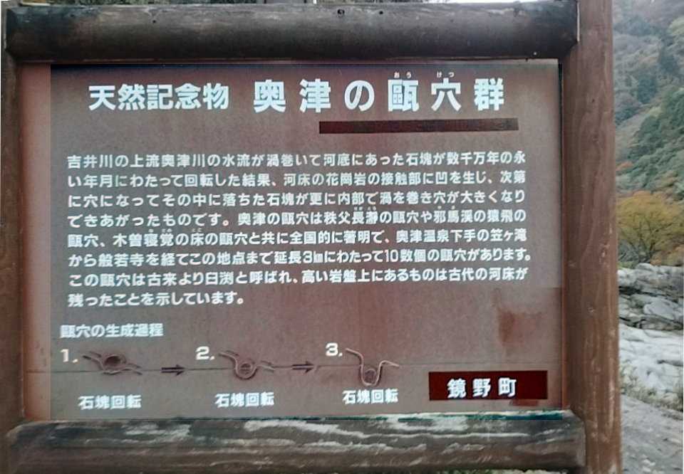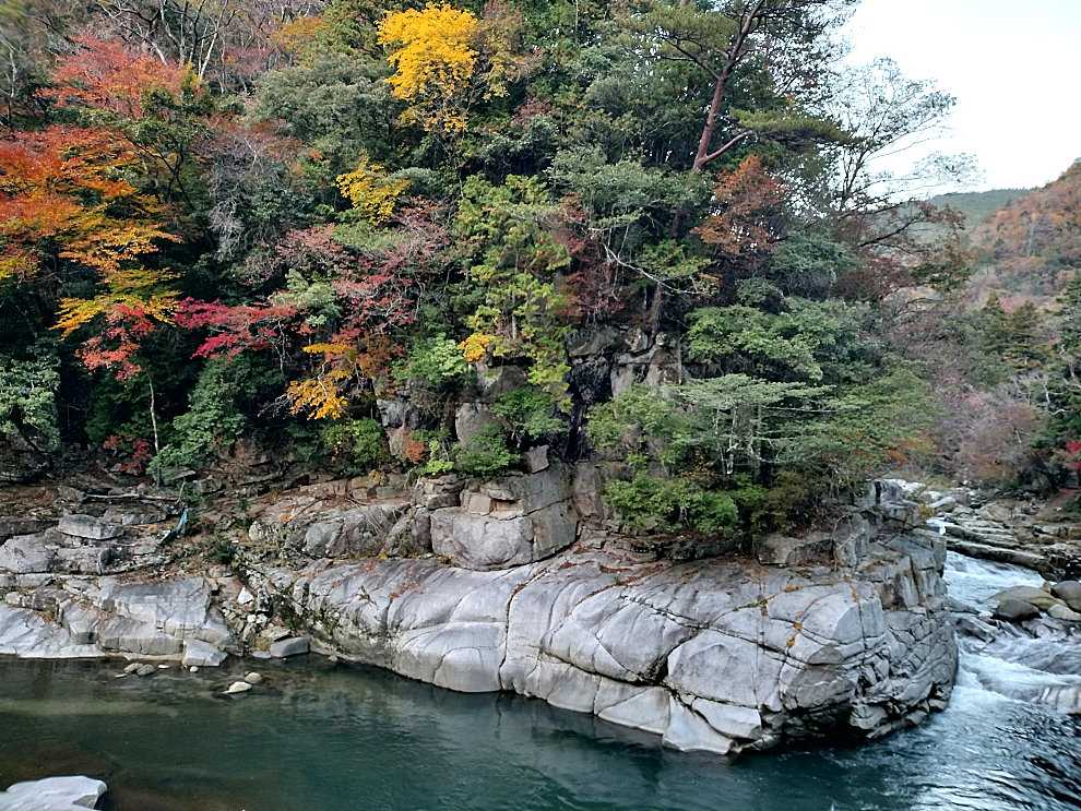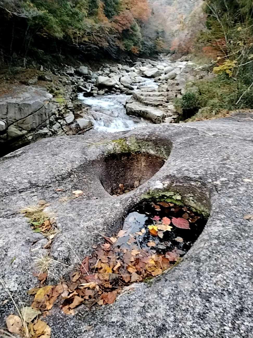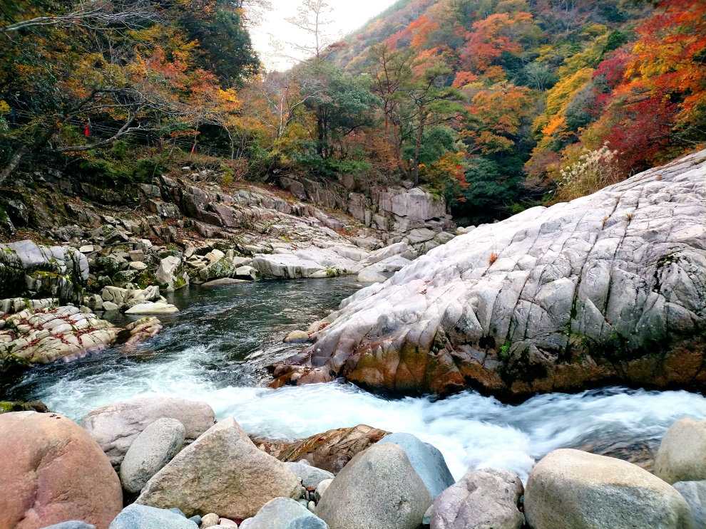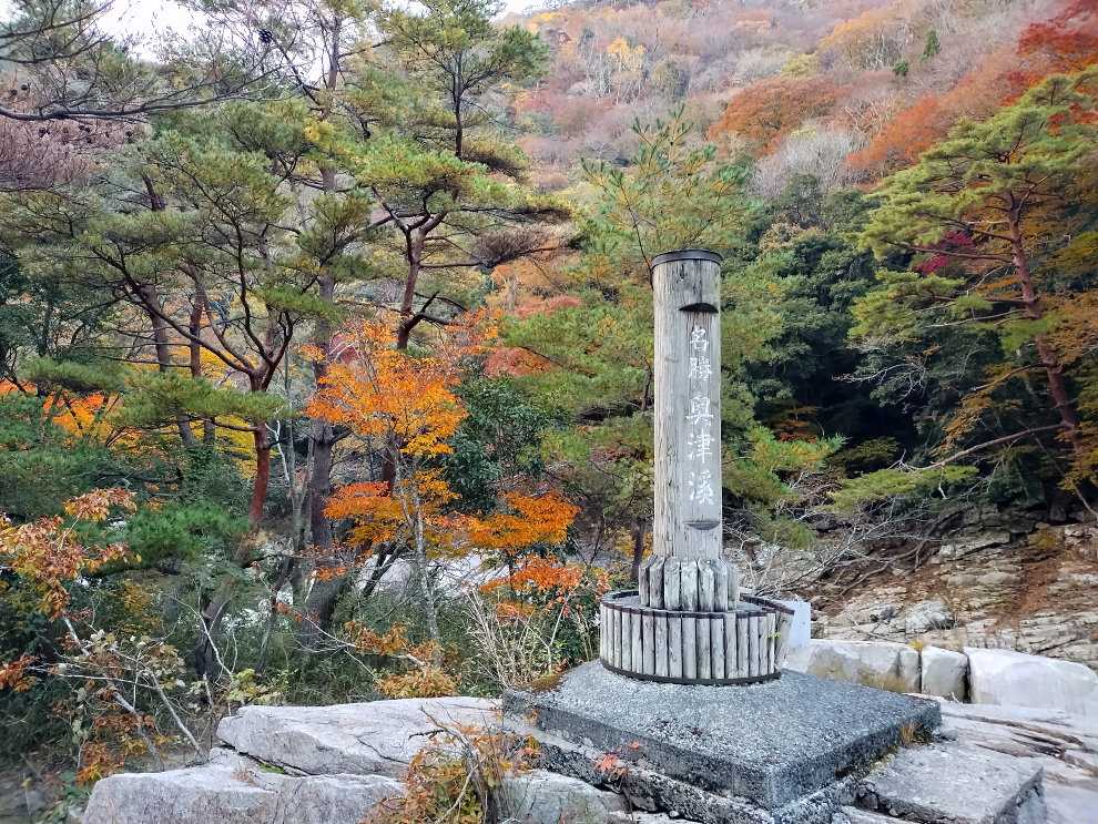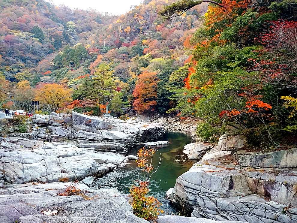 の帰りに奥津渓に立ち寄りました。奧津渓もみじ祭り【2025年11月01日(土)~11月16日(日)】開催期間ということでしたが、日没前後の時間帯であったため、甌穴の看板のあたりに駐車スペースを見つけ、川まで降りて散策することができました。