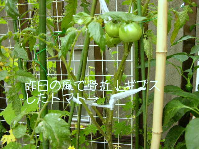 今朝はどうしたことか寝ぼすけミーちゃん、早起きして待っていました。なんとトマトが骨折!//早速荷造り紐でぐるぐるに(ギプスのよう)・・これで直るといいが?・・・ゴーヤーは大丈夫でした又一段と大きくなってきました一緒に覗いてますがなにもたべられませんよ~だ。