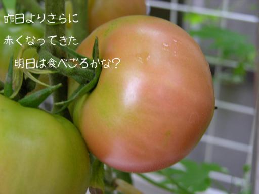ベランダのトマト・昨日よりさらに赤みを増していよいよ食べごろ近しまだまだ先!ニャンコは今日も眠そう頭の中は☆だらけ昨夜は靴を履いて大騒ぎし過ぎ!今朝はごらんの通りのぐうたらニャンコ
