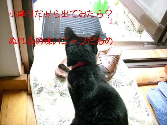 今朝も朝から雨でミーちゃんつまらなさそうなんで雨ばっかり降るんだよッ<梅雨だもん>