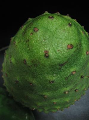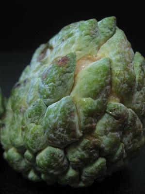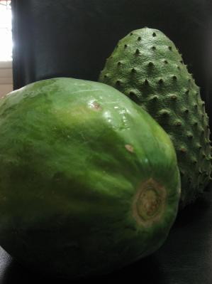 パパイアの向こうにでんと座っているヴァナバナ(GUANABANA)怪獣の卵 というよりも怪獣みたいどんな味なのかちょっと楽しみ作:林尚