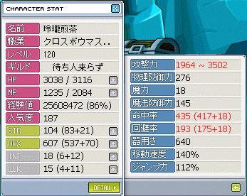 東方紅魔郷+永夜抄届いたッ!!これでまたツクールゲーの完成が遠のくぜ!!さてメイプル忘れていたので弩のステ晒し素INT6なのは聖魔育成真っ最中のときにレベル上げてしまって反射的にINT上げちゃったからです。恥ずかしいからあんま見ないで。ハイLv121折角だからオレはこのシャープアイズを上げるぜ!1上げるだけでいいのですがかけ直すのがめんどいので3上げておく。どれくらいの変化が見込めるのかな。後半SDTのクロコで試し撃ち。今回のドロップ書はペット移動60%,移動靴60%,銃60%*2,ナックル60%追記:紅魔郷プレイ結果レッドマジックで全滅。抱え落ち多すぎです。更に追記:紅魔郷ノーマルなんとかクリア。Exカゴメカゴメで撃沈。やっぱりパターン化は必要ですね!