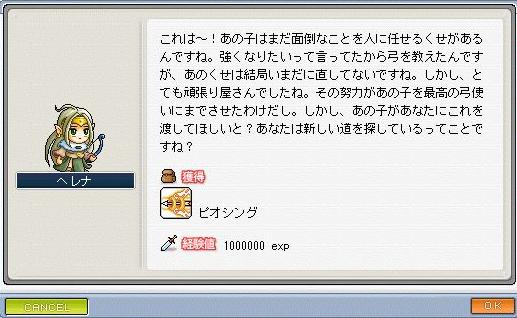 前回フリズベルクを習得したあたりで眠いから終了した弩のスキル習得。今回はまず弩の主力となるスキル「ピオシング」を狙って黒健太をボコりに行きます!しかし、「貫通する」ならpierceと綴るはず。アクセサリーのピアスの語源ですね。多分。現在進行形、或いは現在分詞ならpiercingになる。どうやって「ピオシング」って発音するのか誰か教えてくれ。そんなどうでもいいことはさておき10分くらい黒健太をベルクと一緒に粉砕していると手袋が出てくる。これをヘレナ様に持っていけば・・・!ピオシング習得である。めでてぇ!次の目標は「弓使いの究極スキル」と会うNPCみんなが言うスナイピングの習得である。クロスボウマスターしか習得できないけど。古い本を解読するのにイカスミ50,魔法の石30,ミネラルウォーター10がまず必要となる。ここでアルケスタのクエストを終了させていない人は需要のまるで無い魔法の石を探しフリマを暫く駆けずり回ることになるが僕はHeroどころか弩でもキッチリ終わらせているのである!そういうわけで楽々1段階は突破。その後シャモスやらヘレナやら修行者やらいろんな人のとこをタライ回しにされ最終的に神殿前の亡霊に行き着く。で、ここでこのオッさんが闇の霊魂石なるアイテムを50個持ってこいと仰りやがる。この霊魂石決してドロップ率は高くない。しばらく神殿を行ったり来たりするハメになるのである。霊魂石のドロップ敵はワイルドカーゴ、タウロマシス、タウロスピア、いい男。折角だからパワエリもらえるほうの霊魂石クエストも終わらせることにした。ワイルドカーゴから開始。とりあえずピオシングの錆になってもらおうじゃないか。えいっ※スキルレベル1ですその後こういう物が出たりいい男に2回出くわしこういうモノをくれたりしました。こんな感じで神殿を多分1時間くらい徘徊しなんとか霊魂石を50個集める。さぁここからが本番だ、カタジュニア君に手伝ってもらって専用マップでいい男を300体倒そうじゃないか!↑いい男パラダイスの様子ちなみにいい男は勿論容赦などしません。与えてくるダメージは通常通りなのでちょっとでも油断をすると自慢の爪や炎や隕石で瞬殺されます。こうしてスナイピングをホイホイ習得。さぁ試し撃ちだ。究極スキルというからには決め台詞のひとつくらい必要だろう。うーん・・・ハイラインに連れ帰ってむりやりにでも俺のものにしてやるダメだ・・・この台詞だと2章で死ぬ子になってしまうし何よりも色々・・・こう・・・よい子も見てるこのブログにはマズい気がする。・・・あ、思いついた。しぬまえに かみのちからとくと めに やきつけておけ!!スナイピング発射ッ!!1この後骨魚狩ったのですがSS失念。最後に勝手にビシャス企画して2回撃破。死ななかったのはエルクィネスのおかげだと思う。2回でEXP10%。侮れない。今回のドロップ+読めない本+ゼネラルパンツ緑+ビートル青+ゴールデンクロウ-2+アールン火+リネックスシューズ青書は攻撃片手鈍器60%,弓60%