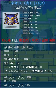 いよいよ目標を見失った感が濃厚なので使い道のない金を稼ぐ旅に出ようかと考えています。波状です。気が向いたので斬りソロビシャス。Lv123に上がったことでミスが減ったせいかついに10分切った!まだ必中すらしていないというのに…恐ろしい子!さらに弩でもビシャス。1回目撃破してファントムウォッチをちょっと狩ってLv122にアップ。(上がった瞬間落とされたためSSはなし)2回目も普通に撃破。薬ケチらなければ余裕で勝てる相手なのね。火毒もGPWで遊んでるうちにLv122。1日に2キャラがLv121→122とは稀有な…途中こんなものをドロップ。なんでレア等級なのにエピックオプションのはずのDEX6%がついてんの?あと、つくなら他の装備についてくれよ…続けてデュアル出陣。稲妻十字空烈刃!!これをかわしたMOBは一匹としていない!!そんな感じで遊んでたらLv76にアップ。トルスピ連携の封印がとけられた!威力こそブラッディに劣るものの制圧力は圧倒的。3次前半でこの有様なんだから恐ろしいね!5番手にHero登場。緑トカゲを狩る!…ミサイルタンク20なんてなかった。この後は露店めぐってみたりついにウィンドシューターを作ってLv10になるや否や任務を放棄してオルビスに移動したりして終了。これで全ての職業が揃った…いや、あと一人残っているか。それは初心者…!今、初心者にも唯一複数攻撃可能なレジェンド、薬の効率がいい市民とかさまざまなバリエーションがありますがやってる人いるんだろうか。今回のドロップ