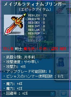 こいつの処分法をわりとマジで募集してます。波状です。訪れる飽きから逃げるようにMDMにやってきましたアラン。こいつといいBPといいルディ深部の敵はおいしいのですが氷耐性のためスノーチャージOFFを余儀なくされます。弱点ならサクサク狩れるのにと思うと微妙にもったいない気分になるというか。もっとも氷弱点なんてLv近い敵だとパープン系とバクくらいしかいませんが…BPでレベルアップ!Lv111になりました。いつの間にかこいつが次4次するみたいな空気になってますね。スウィフトムーブでトス連打やってみたいというのはありますが。しかしジャクムがねえ…狩り終えた後は露店あさり。なんかないかなーと思ってたらあった。なぜか未確認ATK135タイムリーフアルシュピス200m。あれこれ考える前に既に購入していた。さて鑑定だ、いざぁ…!キューブを回そう、な!装備したらこんな感じ。イケメーンwwwwwww至極満足しました。あとはダーク♂インペールを待つだけだ。今回のドロップ無数の店売り装備