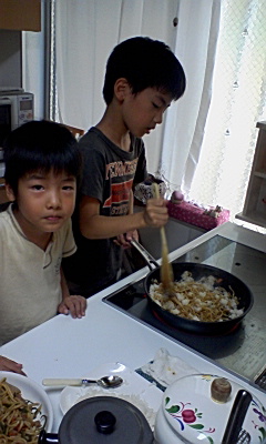 台風20号の影響で連日の大雨・・・本日25日予定していたイチの運動会が延期・・・外は強風の為、お昼は・・・イチの手作りオムライス!!弟たちの分もがんばって作ってくれました!三つ子の内、ヘイが写ってないのですが・・・ケンカして大泣きの真っ最中!!でした・・・