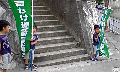 「おはようございます!」と大きな声で登校してくる小学生のお兄ちゃん、お姉ちゃんたちに挨拶をする三つ子たち・・・長男イチの小学校の校門前で毎月12日に行なわれる「愛の声かけ運動」2ヶ月ぶりの参加で朝から張り切っていた!恥ずかしさもなくなり大きな声を出すことは気持ちがいい!挨拶された人も気持ちがいい!来年小学1年生になっても大きな声で挨拶ができる子でいてほしい・・・