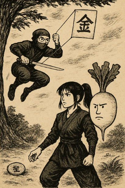 「円安の影響なのか海外の投資家が群がっているようで買い越しのようですね」「株価はアゲアゲのようだけど怖くて今は株に手を出せないよね。まぁ自分の持っている個別株は売りが優勢のようで下がっているけどね」「マスターの刈った切り株に対して利確しているということですかね」「株価を下げている企業のほうが多いようなので耐え忍ぶときですね、とゴウライは進言します」「優待狙いの個別株は気にしないに限るのですぅ」「優待を止めるかもしれないけどねぇ」「まぁ成るようになるさ、鳴れば涎のパブロフ君ってね。仮想通貨ではステーキング報酬を貰ってちょっと嬉しいけど雑所得扱いになるみたいなので複雑だねぇ」ステちゃんが妖精の姿で「金の斧、銀の斧のどちらかしらぁ」と言う、自分が忍者姿で「金の手裏剣と銀のマキビシでござる」と言う二コマ漫画を指示「無課金のAIコナン君だとセリフは適当だねぇ。斧も気を利かして風車の弥七になっているし⋯」「マスターの誤字脱字とドッコイどんぶりですね」「AIーSORA2かGeminiに添削を頼んだらどうなるだろう?」「SORA2は動画が得意みたいですけどね。確か招待コードが必要だったのでは?」「GeminiはAI3D画像でバズっていましたね、とゴウライはムフンと息を吐きます」「誤字脱字は人間味があって良いと思いますぅ」「まぁ誰も気にしないわよねぇ」「誤字脱字ポリスで炎上って無いよねぇ⋯?」「ありえないと思います!」